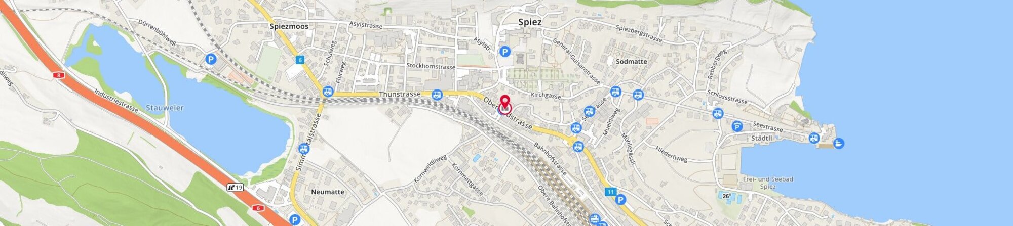 Mit dem Auto: | Autobahnausfahrt Spiez, Richtung Spiez-Zentrum Parkplätze: Lötschberg-Parking, Parkplätze bei der ref. Kirche oder blaue Zone direkt vor Praxis |